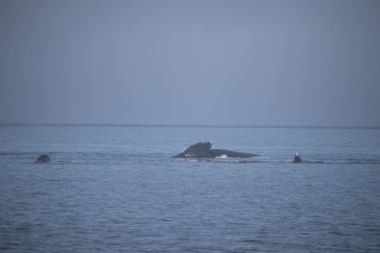 Fog lifts. 10+ whales in the bay. Drone and zoom photography.